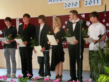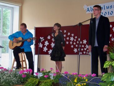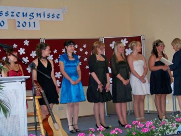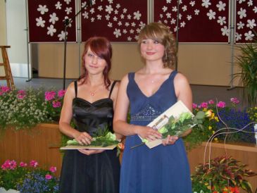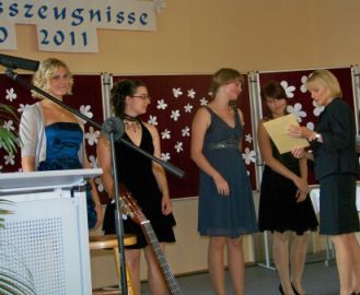 Zuerst ein herzliches Dankeschön an unseren Architekten, Herrn Lothar Lehmann und seine fleißigen Helfer, die es ermöglichten, dass die Zeugnisübergabe in der schönen sanierten Aula in Lohsa stattfinden konnte. Die Blicke auf den Treppenaufgang, das Foyer und die Aula lassen schon erahnen, wie frisch und lebendig der fertigsanierte Bau erscheinen wird. Eröffnet wurde die Feierstunde durch unseren Schulchor unter Leitung unseres Musiklehrers Herrn Friebel. Nachdem Frau Hypko, unsere Schulleiterin, die feierliche Ansprache hielt, fand die Zeugnisübergabe statt. Unsere Jahrgangsbesten sind Sandra Mielsch und Stefanie Weiß aus der Klasse 10a sowie Franziska Symank und Sabrina Steiner aus der Klasse 10b. Ebenfalls für besondere Leistungen in diesem Schuljahr wurden ausgezeichnet: Sabrina Steiner, Sandra Mielsch und Kristin Kieschnick. Es folgten nette Dankesworte der Schülervertreter beider Realschulklassen. Frau Laschinsky bedankte sich auf besonderem Weg bei ihren Schülern: mit eines Ständchen auf der Geige! |