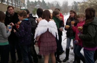 Jahresausklang gesorgt: mit Bratwurst und Punsch! Ein großes Lob beiden für ihre Einsatzbereitschaft. Es hat sich gelohnt, denn es schmeckte nach dem Kegeln und an der frischen Luft besonders gut. Auch zwei Engel waren an diesem Tag in den Klassen unterwegs und ließen Weihnachtsstimmung aufkommen. | ![]() |